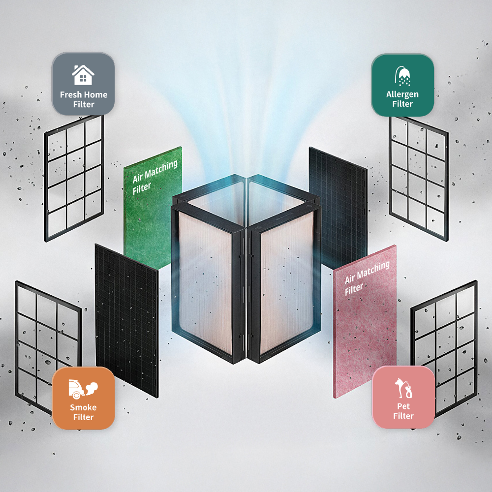 Pilih dua filter sesuai kebutuhanmu dari empat filter yang ditawarkan, allergen filter, smoke filter, fresh home filter dan pet filter.